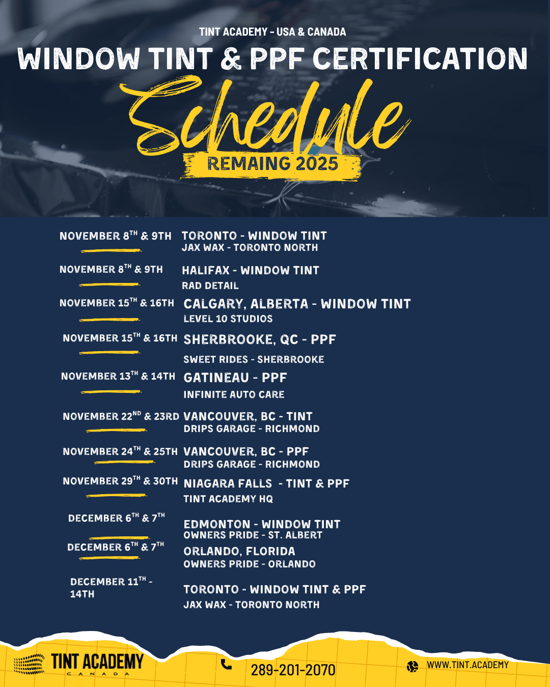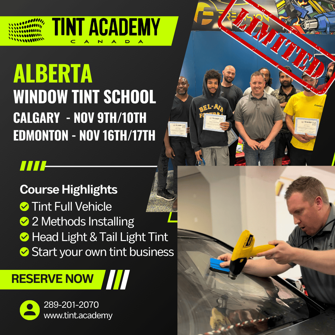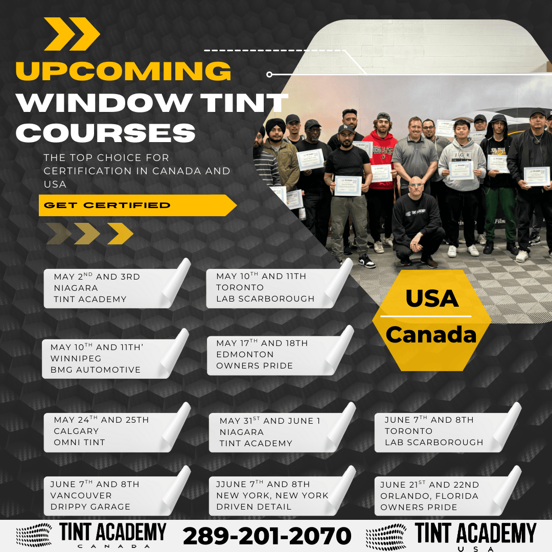 he Tint Academy beats the competition by offering more than just installation training — it delivers a complete path to success. While other programs focus only on the basics, The Tint Academy provides hands-on experience on real vehicles, recognized certification across North America, and business and marketing support to help students actually launch and grow their tinting careers. With experienced instructors, small class sizes, nationwide courses in both Canada and the USA, and ongoing mentorship after graduation, students leave with the skills, confidence, and tools to stand out in a crowded market.